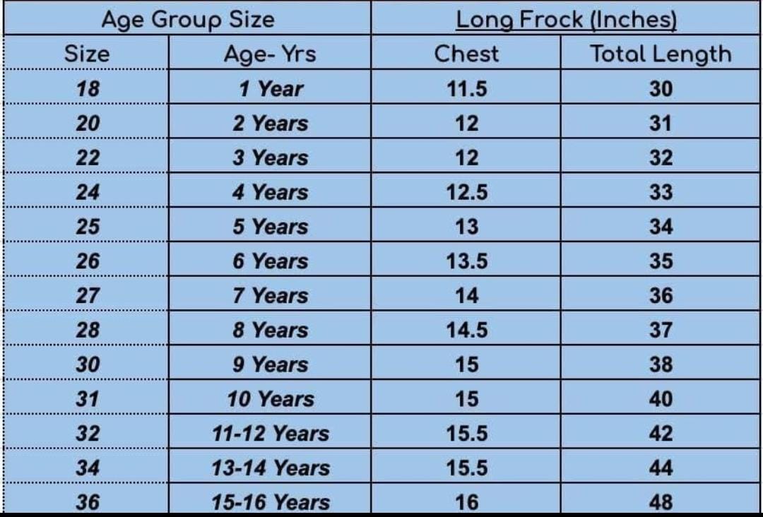 | Kids | 18, 20, 22, 24, 25, 26, 27, 28, 30, 31, 32, 34, 36, 38 |