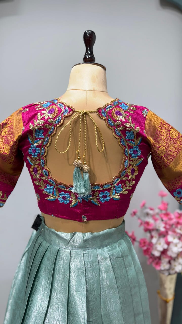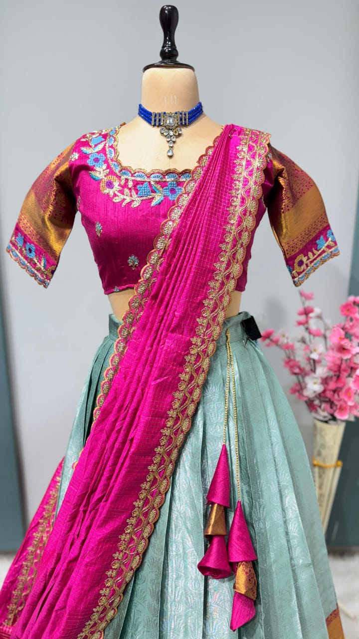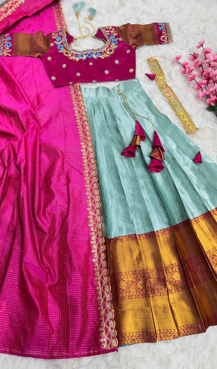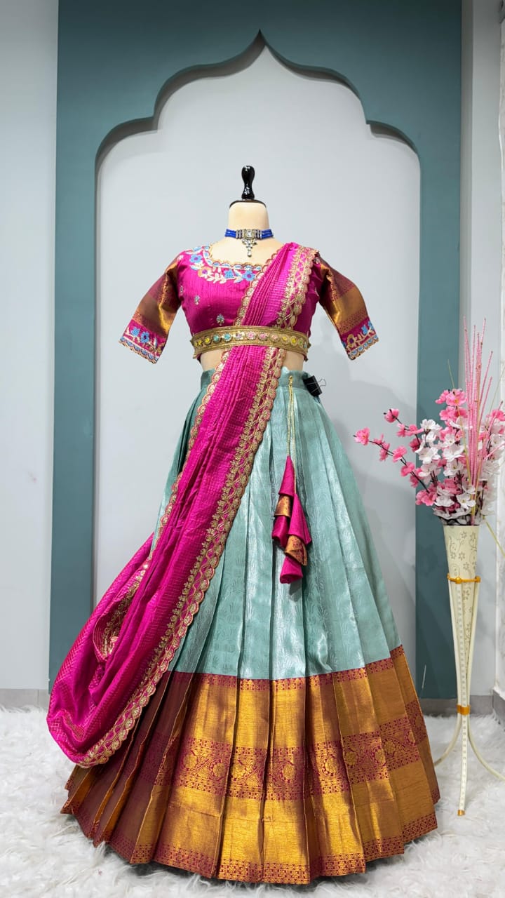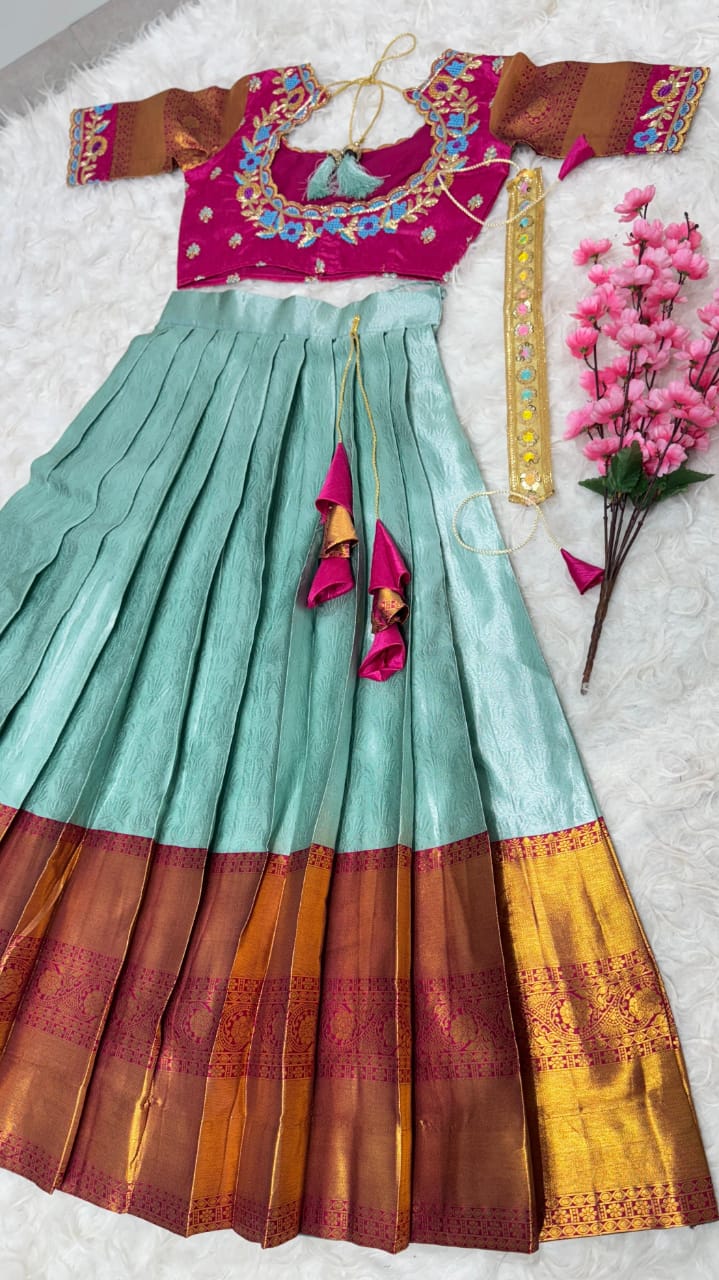 *Lehanga Details*:- Full stiched Kanjivaram silk With big jequard Border attached with Canvas patta zip and Latkan