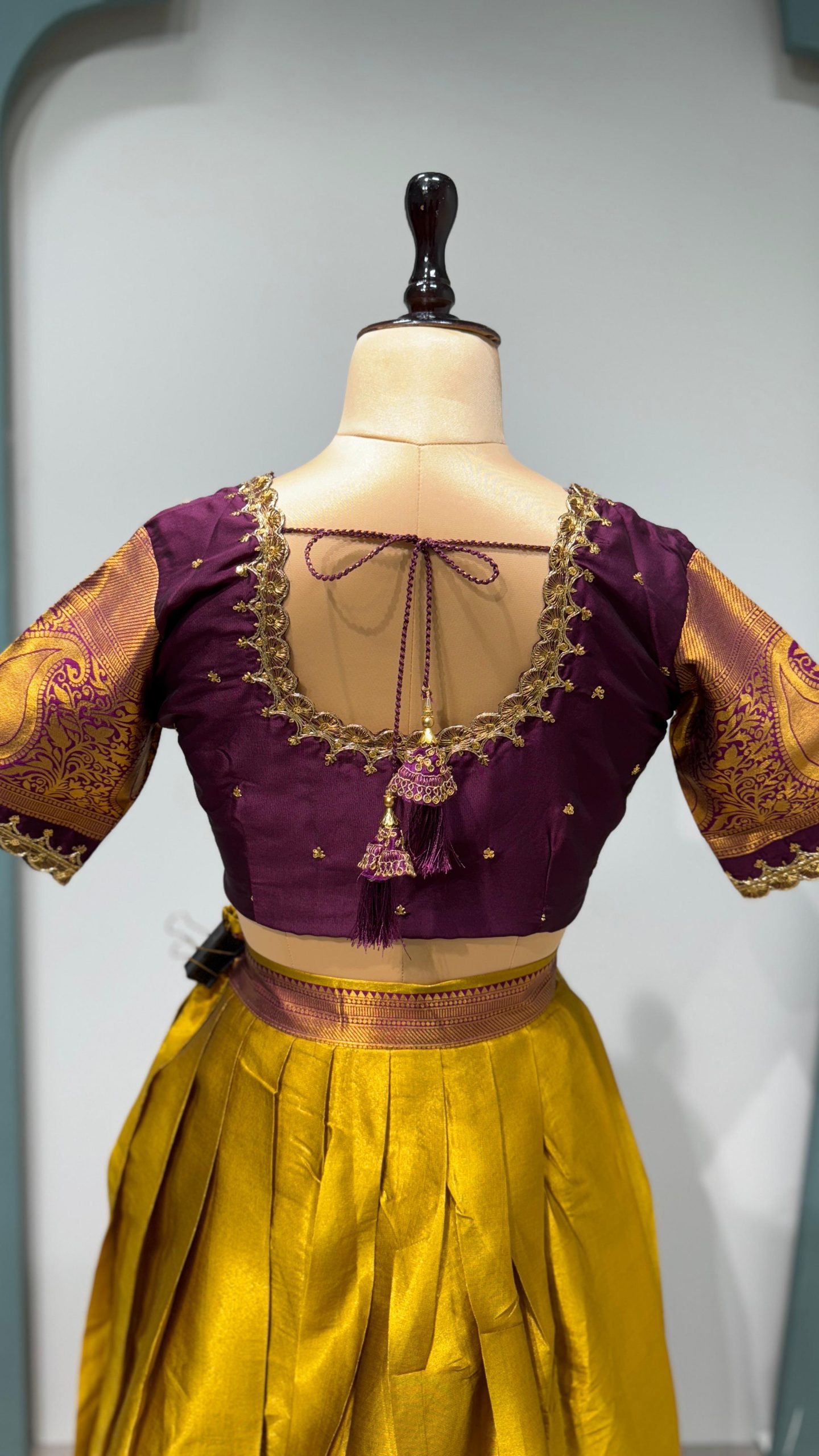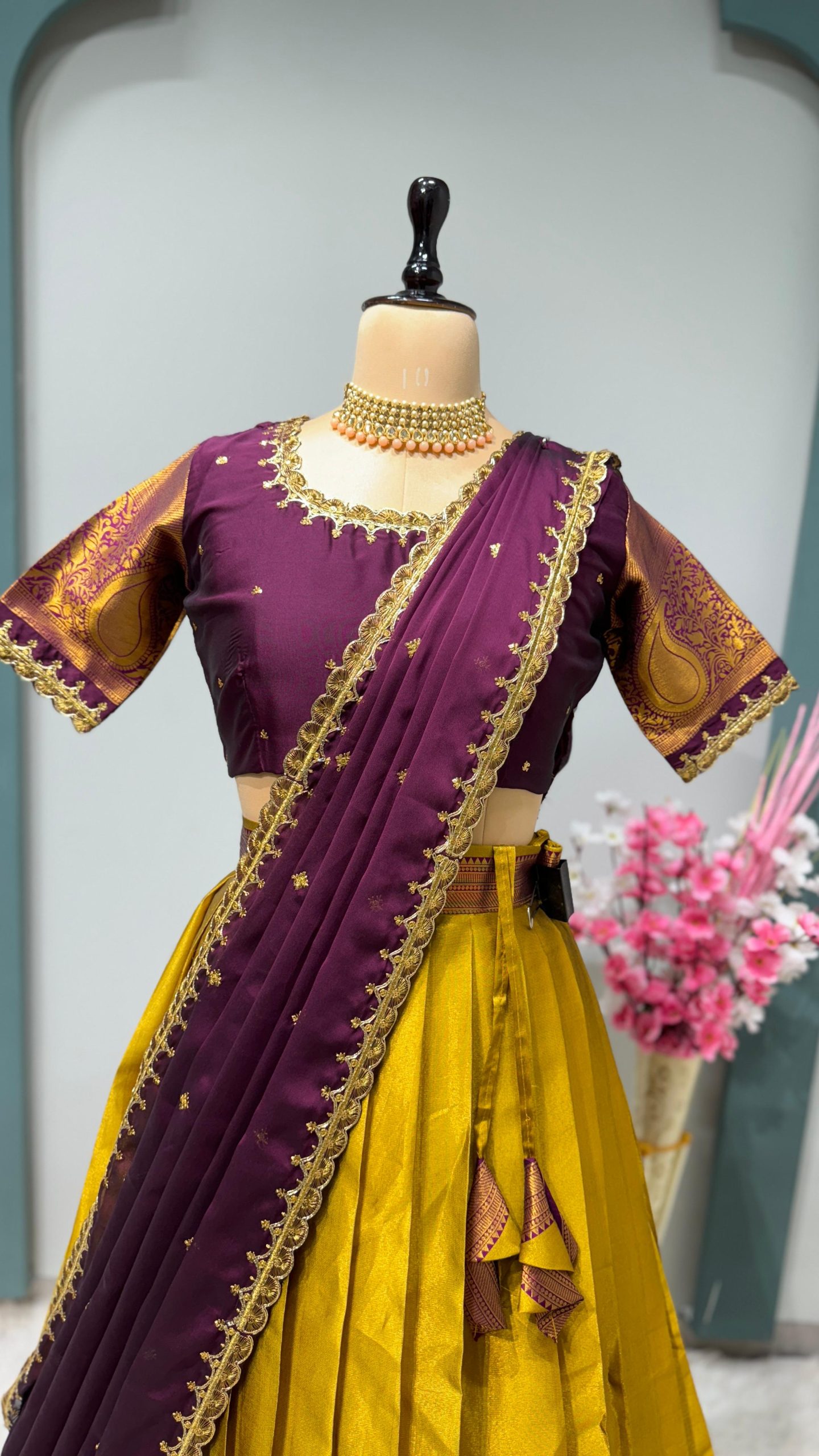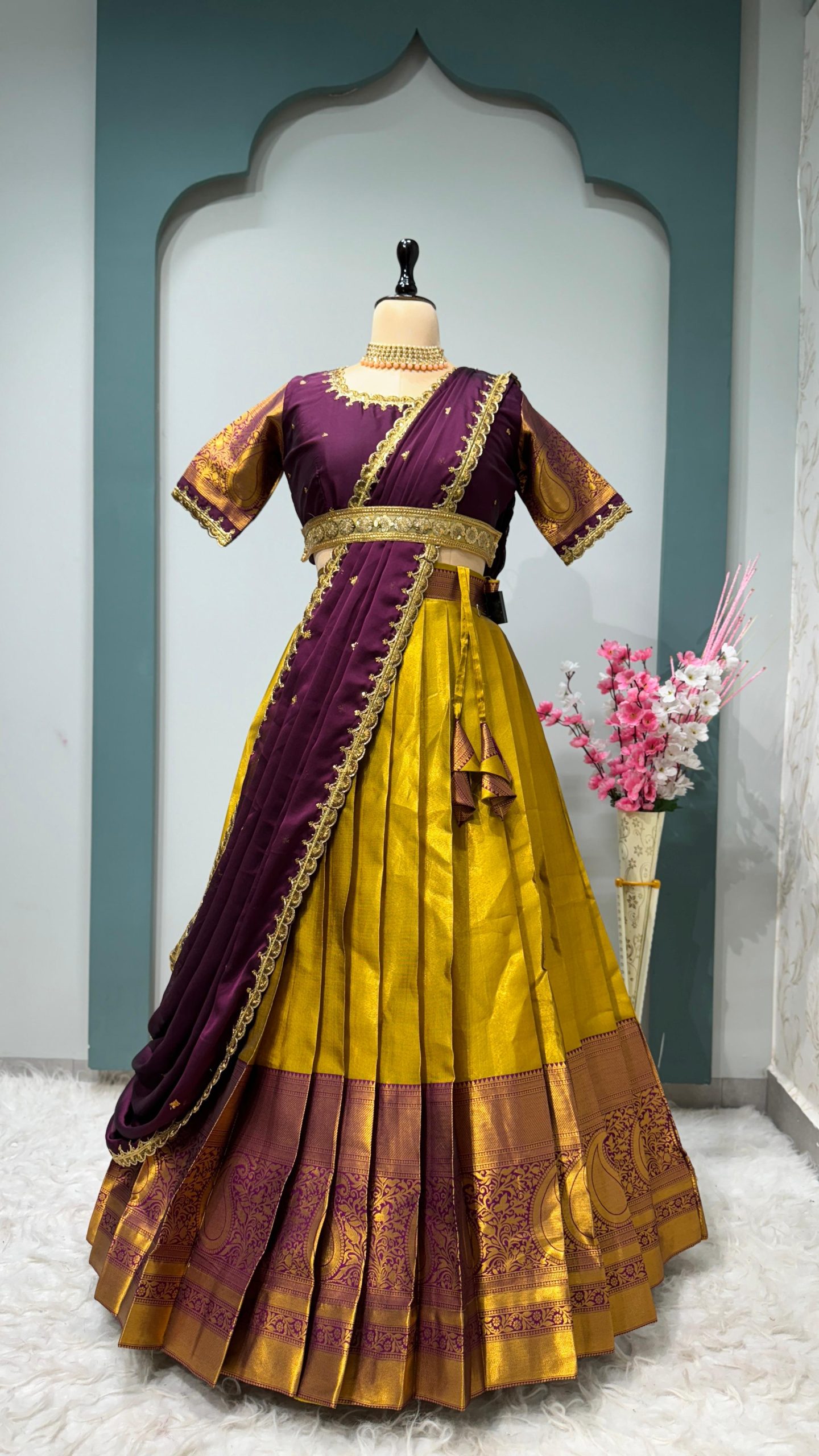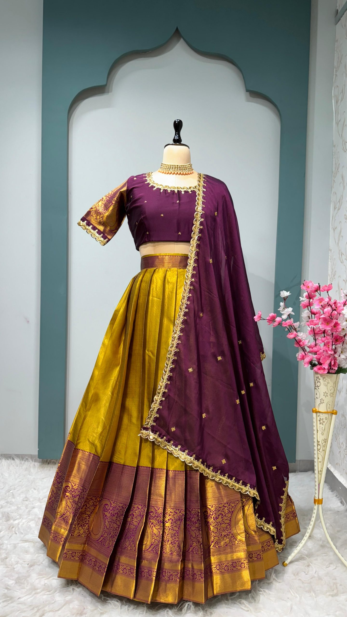Designer Premium Quality Pure Kanjivaram silk full stiched Lehenga With Full stiched Designer Maggam work blouse With Maggam work with Rich butti work with Handwork lace border dupatta which gives u totally Decent and Extraordinary look For this Festival Marriage Season*
